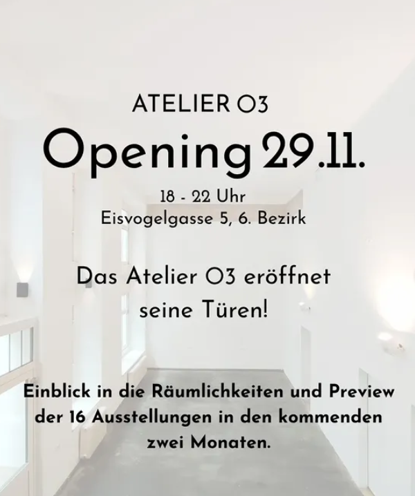 Das Atelier O3 startet am Samstag offiziell ins Eröffnungsprogramm! 16 verschiedene Ausstellungenbespielen in den Monaten Dezember und Jänner den Ausstellungsraum mit den ersten exklusiven Ausstellungen!